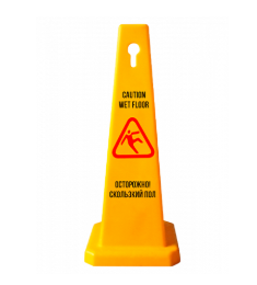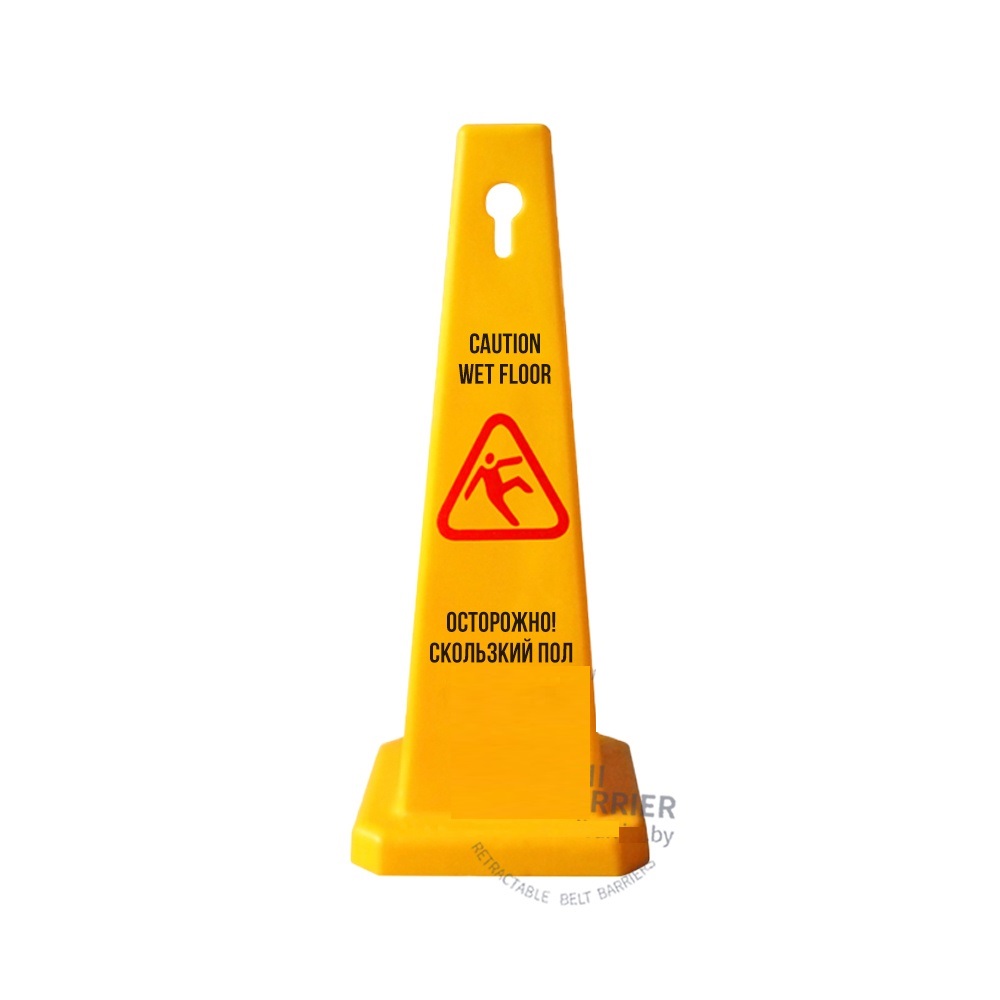 Изготовлен из пластика ярко-желтого цвета . Универсальное изделие предназначено для обеспечения безопасности посетителей во время влажной уборки торговых центров, ресторанов и других общественных учреждений. Знак используется также в местах, имеющих скользкий пол. Надпись на изделие нанесена черной краской на двух языках — русском и английском.