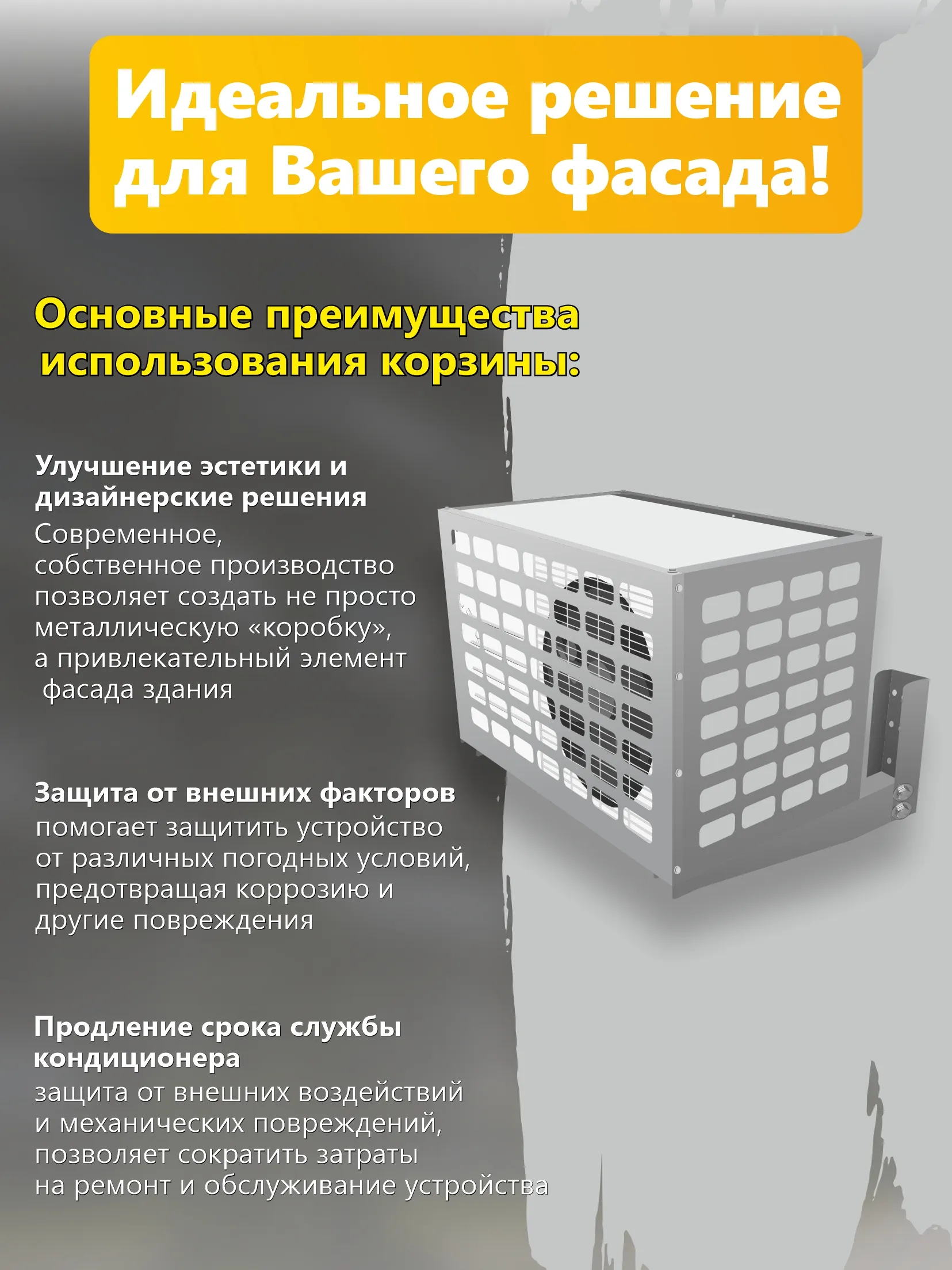 Компания Сигнал предлагает к продаже корзины для кондиционера в комплекте с кронштейном из двух частей, вы также можете выбрать другой вариант кронштейна на ваш выбор, в таком случае цена будет отличаться, уточняйте у менеджеров